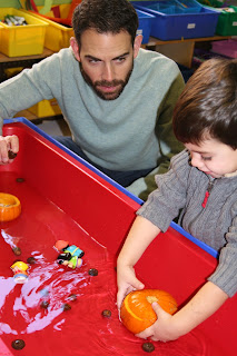 The sensory table was filled with pumpkin "boats", acorns and Little People |